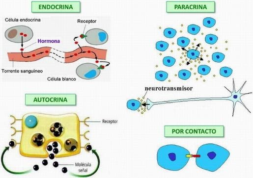 1. Endocrina: Cuando la célula emisora y la receptora están en sitios muy lejanos del cuerpo (por ejemplo el estómago y el cerebro). En este caso los mensajeros van a transportarse por el torrente sanguíneo, como las hormonas.